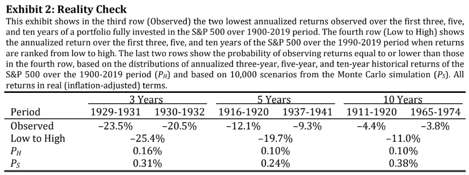 這張表選擇了3年、5年、10年的年化報酬率做了比較,首先我們先看 3 Years這欄的第四列Low to High,這裡表示的是從1990年至2019年的歷史數據中選出報酬率最低的三組,並將這三組數據由最低排到最高的年化報酬率-25.4%,但這筆數據在歷史上從未出現過,歷史上真正開局最差的前三年,出現過連續三年最低的年化報酬率分別是1929年至1931年(-23.5%)以及1930年至1932年(-20.5%)。